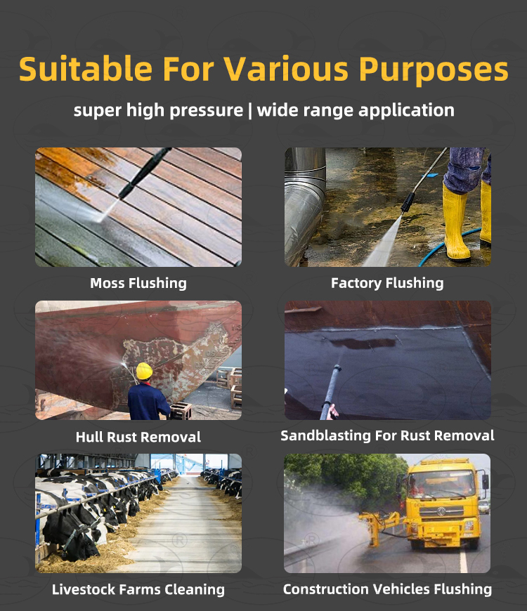 - Versatile Applications: From municipal, industrial, agricultural, and residential pipe cleaning to sandblasting rust removal and deck washing